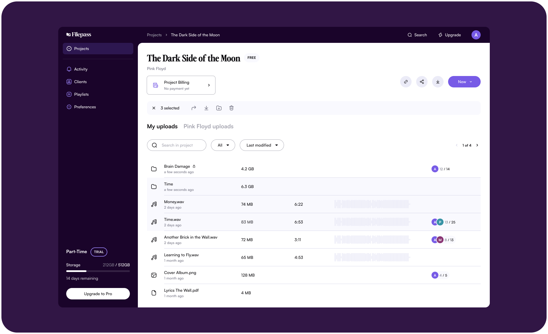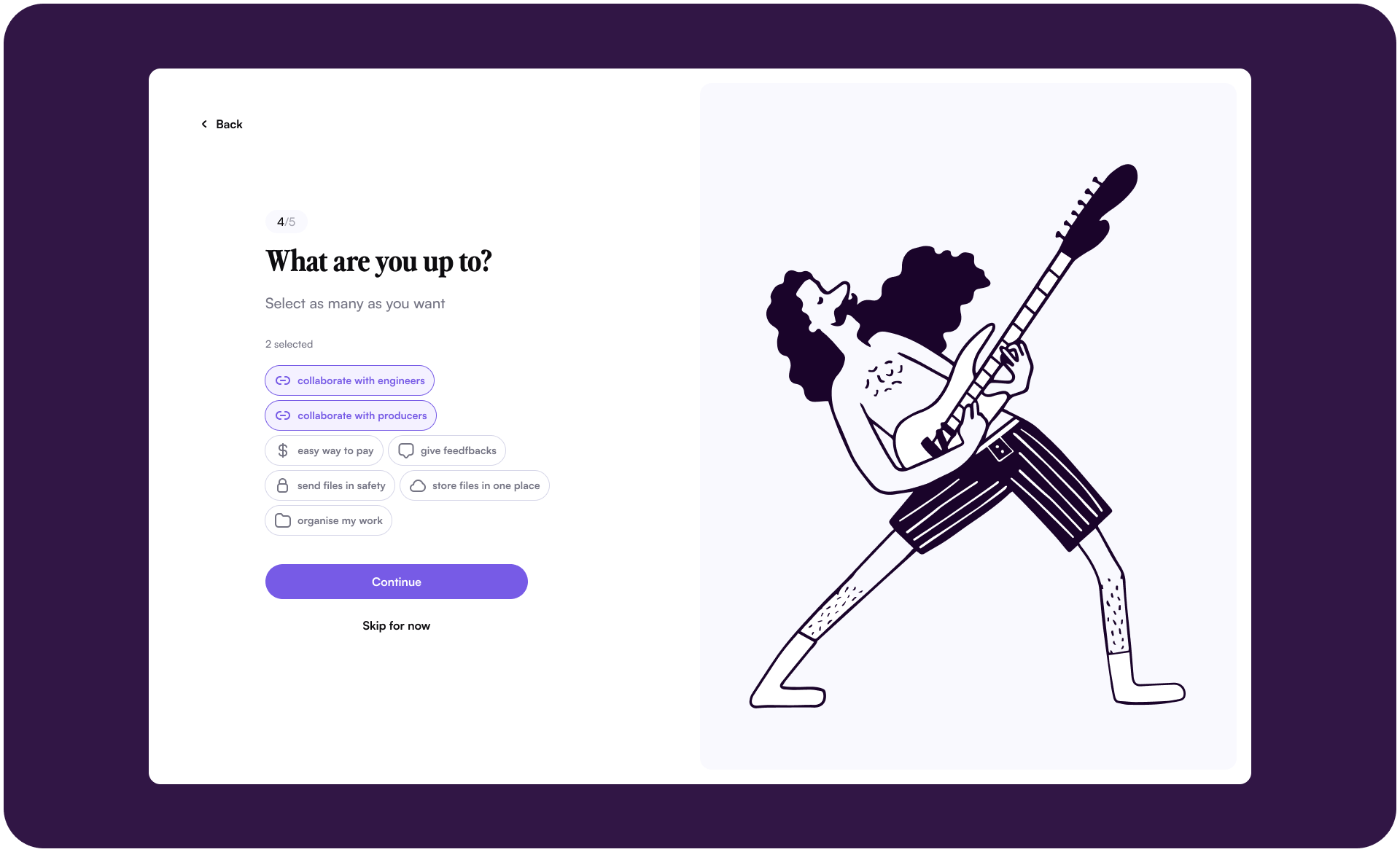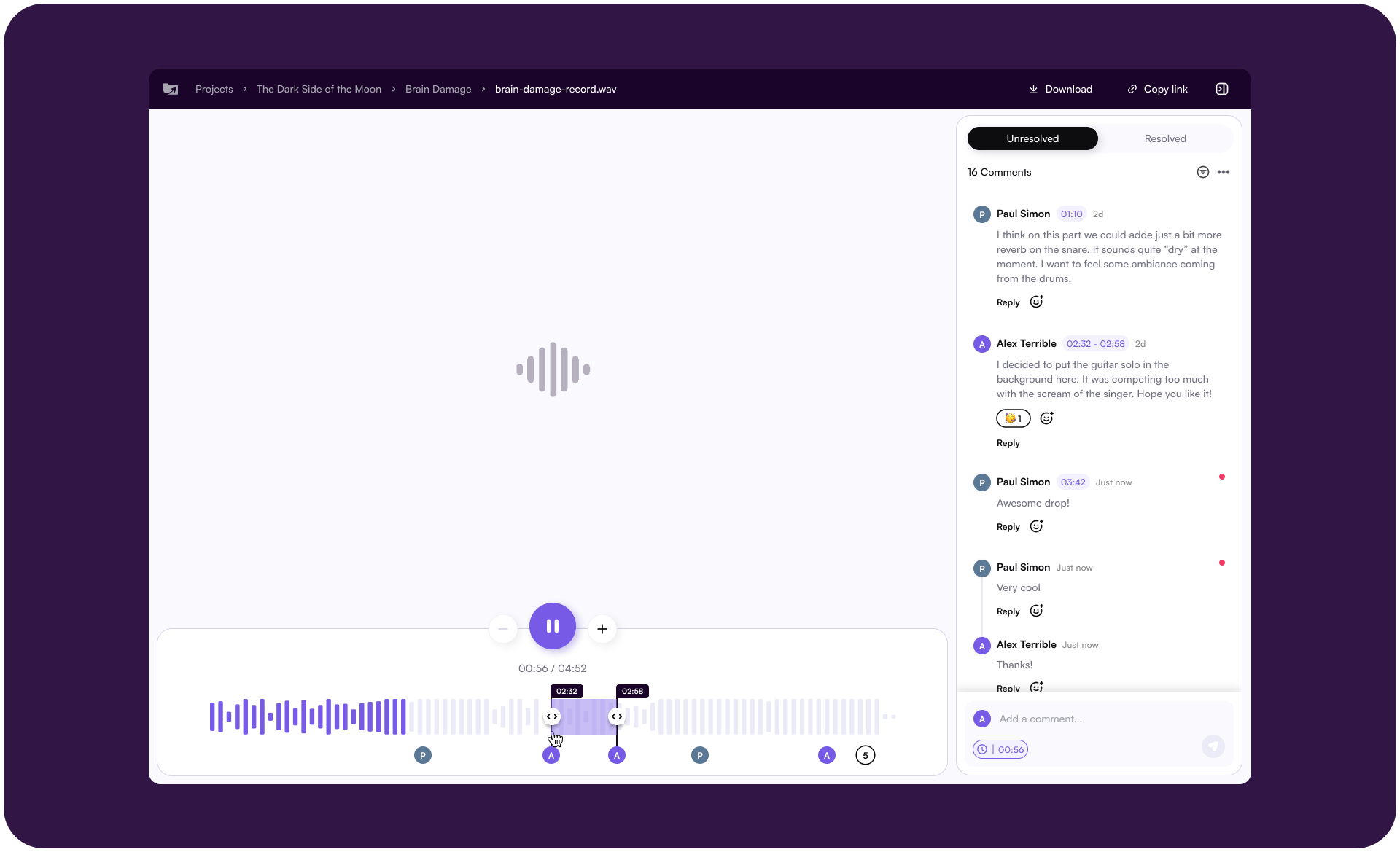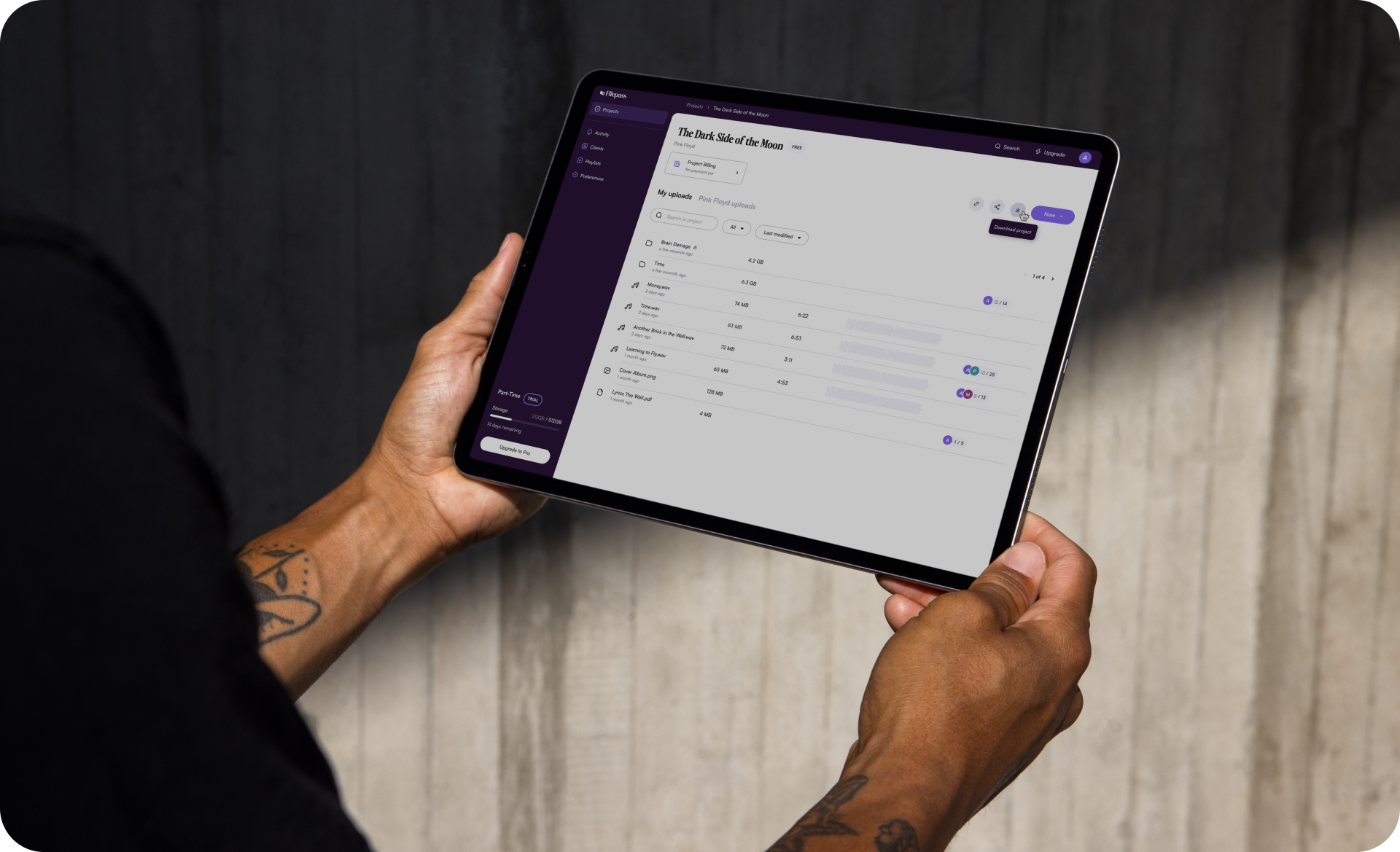 Music is uploaded directly to the platform, clients can leave timestamped feedback and project files are gated behind a paywall to protect IP.