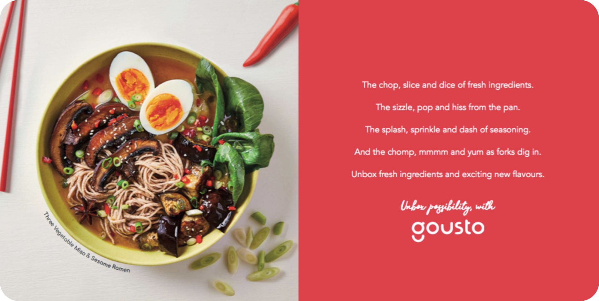 Gousto is the UK's leading recipe box company, where customers can choose from a selection of popular recipes each week.