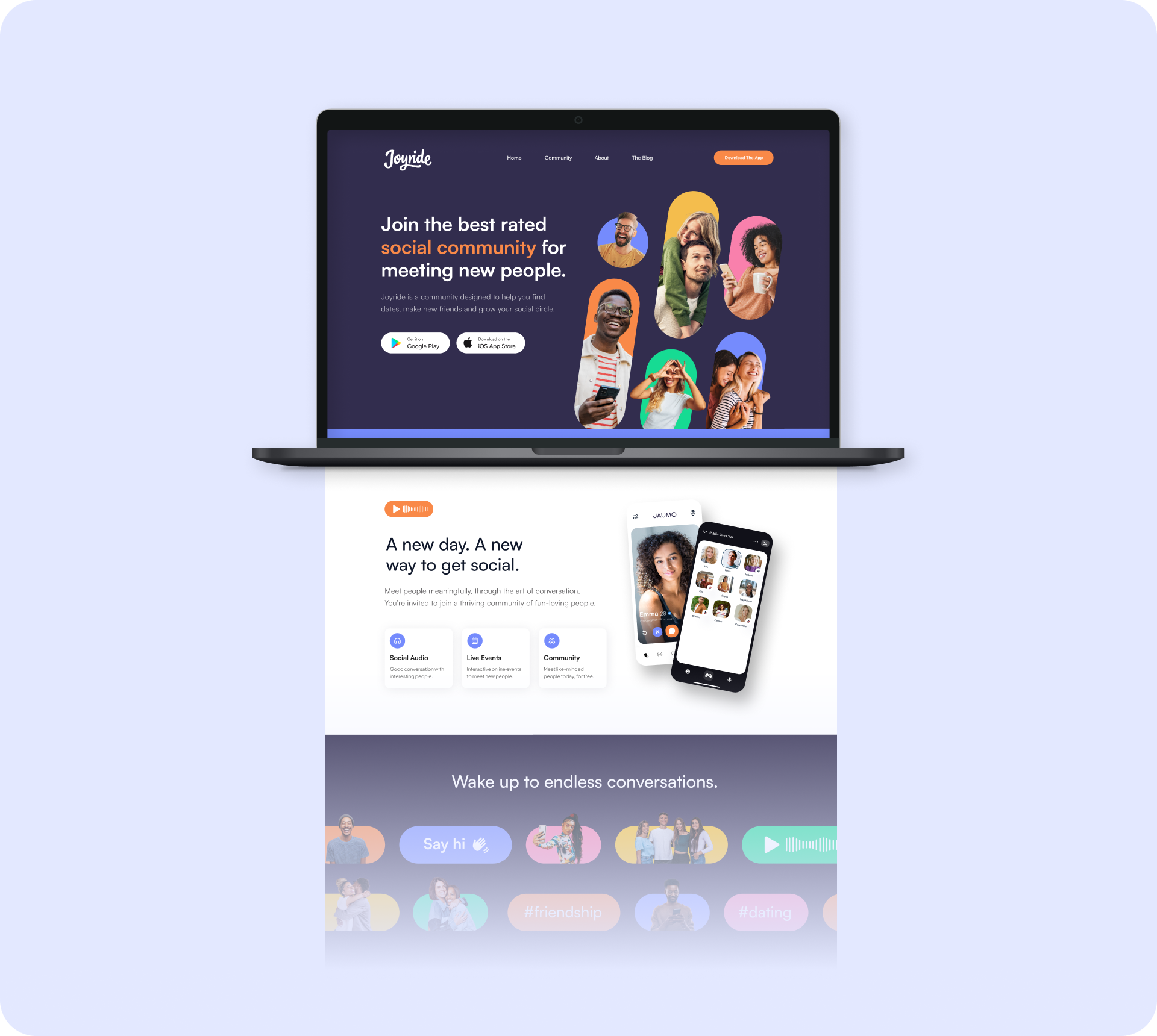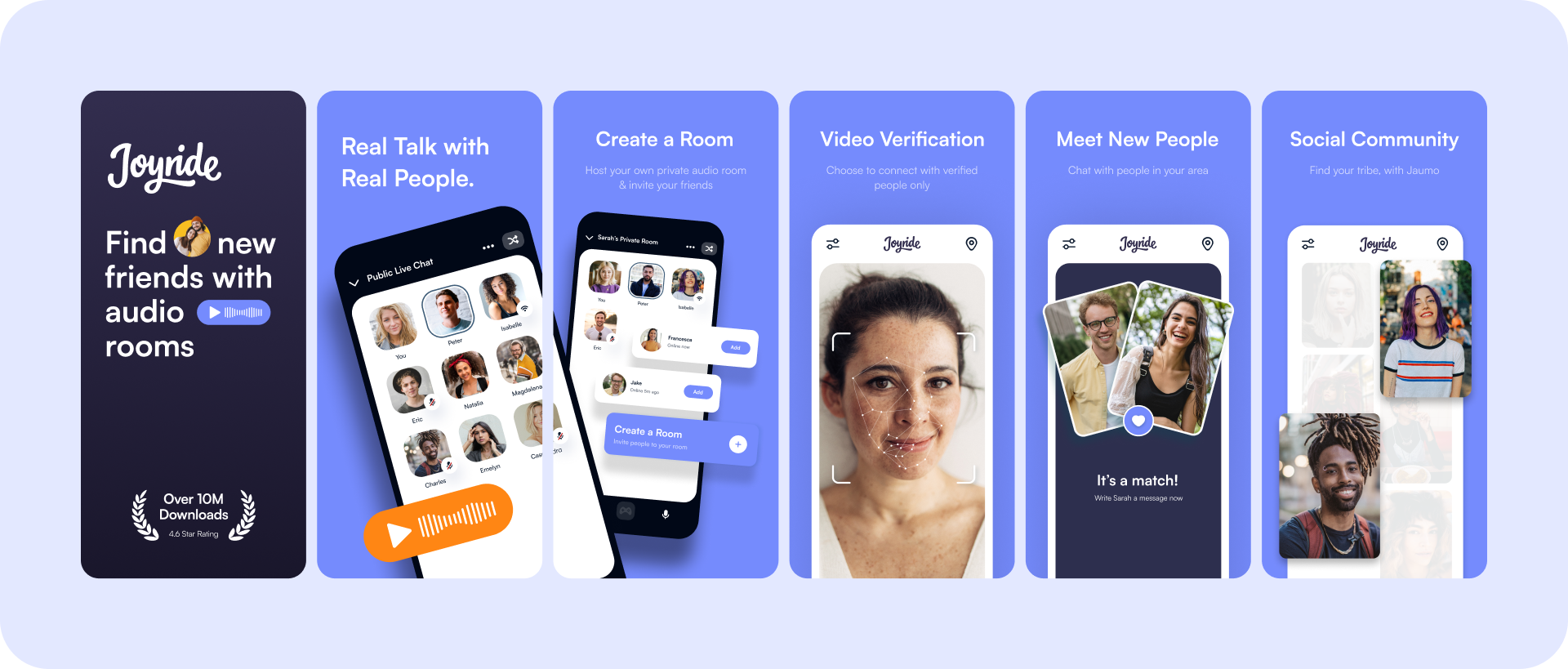 Joyride is a social platform that connects users with potential friends using live audio conversations. Connect in groups or one-to-one and have genuine conversations with new people.